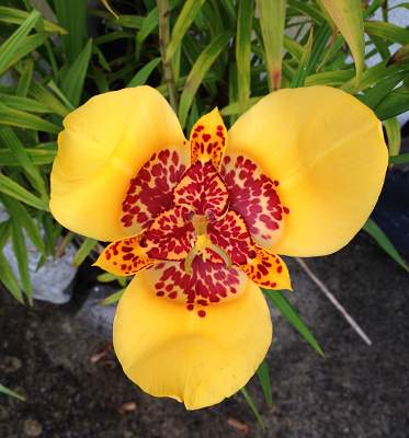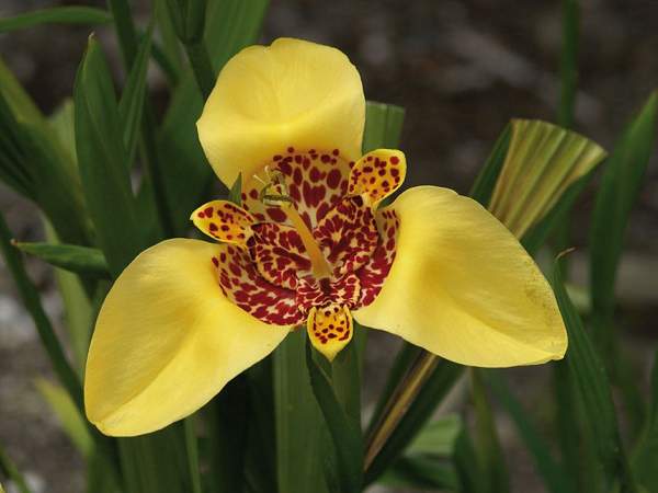 Тигридия павлинья Yellow (Йеллоу). Многолетнее клубнелуковичное растение. Высота до 45 см. Диаметр цветов составляет 10-15 сантиметров, лепестки большие ярко — желтые с тигровой окраской середины в виде красного крапа.