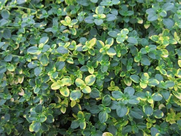 Тимьян лимоннопахнущий Sambesi (Замбези). Высота 20-25 см. Листья мелкие, округлые, зеленые с желтыми всполохами; обладает прекрасным лимонным ароматом и используется для пряных мясных блюд. Цветки мелкие, фиолетовые, распускаются в июне и цветут до июля.
