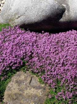 Тимьян ползучий Elfin (Элфин). Полукустарник с приятным сильным ароматом, используемый в лекарственных и кулинарных целях. Несмотря на малый рост (всего 5 см), "Эльфин" представляет собой удивительный цветочный ковёр, состоящий из переплетённых между собой стеблей, ароматных листьев и мелких, нежно розово-фиолетовых цветков.