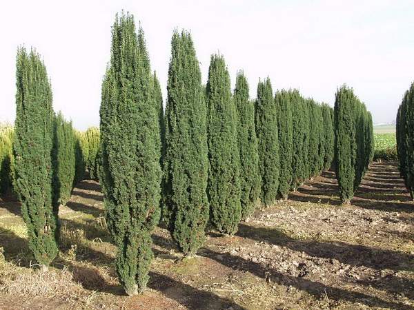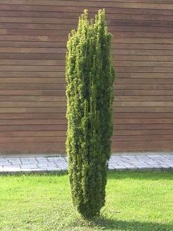 Тис Fastigiata (Фастигиата). Широкий колонновидный хвойный кустарник. Растет медленно до 12см в год. В 10-летнем возрасте высота 2,5м при диаметре кроны до 0,8м. В молодости крона более узкая, с возрастом начинает разрастаться в ширь. Ветви короткие, плотно расположены к друг другу. Хвоя 2,0 — 2,5 см длиной, черно-зеленая; загнута вовнутрь, расположена на побегах спирально. Обильно плодоносит.