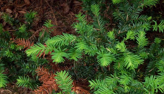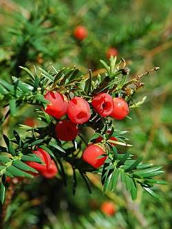Тис канадский. Это невысокое растение с буроватой корой и острой, желтовато-зеленой, слегка изогнутой хвоей, достигающей 2,5 см в длину и 2 мм в ширину. У основания хвоя обычно длиннее, чем на верхушке, зимой она становится красновато-коричневой. Зацветает в марте, плоды шаровидные, ягодоподобные. Растет тис канадский очень медленно, ежегодный прирост не превышает 5 см, весьма морозоустойчив до -35°С.