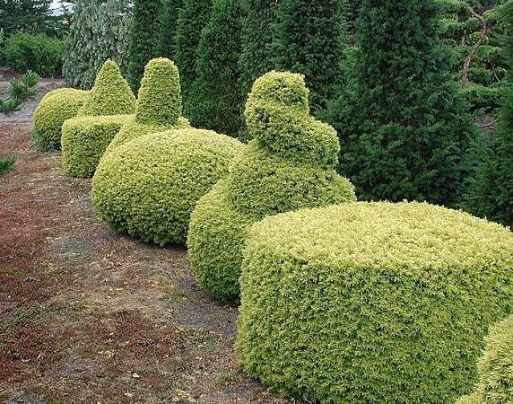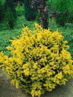 Тис Semperaurea (Семперауреа). Мужская форма, куст широкий густой, растёт медленно, к 10-ти годам h=1 м, ширина 1,3 м, ветви почти вертикальные, молодые приросты ярко-золотистые, позже жёлто-зелёные, свой цвет сохраняют в полутени. Рекомендуется для групповых и одиночных посадок на фоне газона, на альпийских горках, для выращивания в контейнерах при озеленении крыш и террас. Морозостойкость до -23ºС.