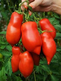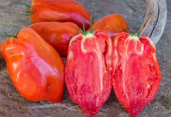 Мякоть томата мясистая, насыщенного красного цвета и с малым количеством семян, не водянистая. Вкус хорошо сбалансированный с преобладанием сладости. Сорт болезнеустойчив и вынослив. Идеальный томат для густых соусов, вяления и пасты.
