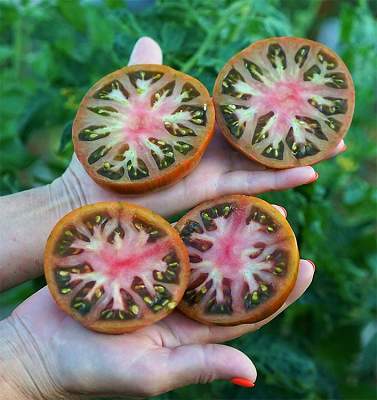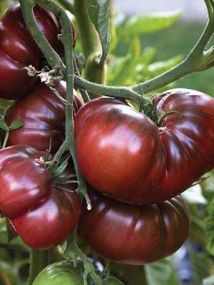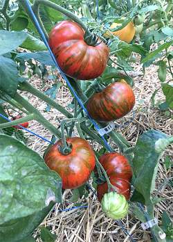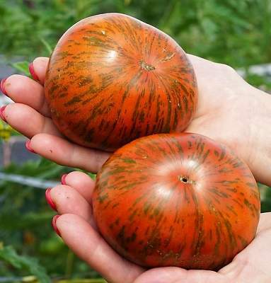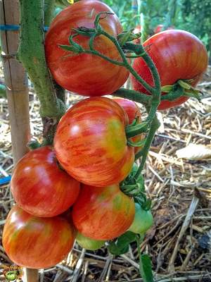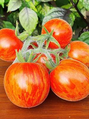 Томат Амазонка Полосатая. Среднерослый сорт из США. В открытом грунте высота куста составляет до 1 метра, в теплице — до 1,5 м. По срокам созревания — среднеранний, отличается дружным созреванием. Плоды плоскоокруглые, выровненные, тёмного красно-коричневого цвета с полосками и штрихами тёмно-зелёного цвета. Масса 200 г.