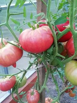 Томат Башкирский Красавец. Индетерминантный томат, мощный и высокорослый. Побеги вырастают до 1,8 м, нуждаются в подвязывании и пасынковании. Формировку ведут в 2-3 стеля. На кусте формируется 7-8 плодоносных кистей. Сроки созревания средние — через 110-125 дней с момента всходов. Помидоры крупные, насыщенного малинового цвета.
