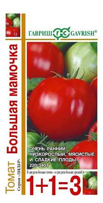 Томат Большая мамочка. Очень ранний детерминантный (с ограниченным ростом) низкорослый сорт. Сочные красные сердцевидные плоды, массой 220-340 г созревают на растении уже через 85-95 дней. Мякоть с насыщенным сладким вкусом, высоким содержанием полезных веществ и ликопина — выгодное и неоспоримое достоинство нового сорта именно для употребления в свежем виде, приготовления соков, томатных соусов и пасты. Рекомендуется для выращивания в открытом грунте и пленочных теплицах. Посев на рассаду — в конце марта-начале апреля. Пикировка — в фазе первого настоящего листа. Высадка рассады в теплицы — в мае. Схема посадки: 40х50 см. Через несколько дней после высадки растения подвязывают.