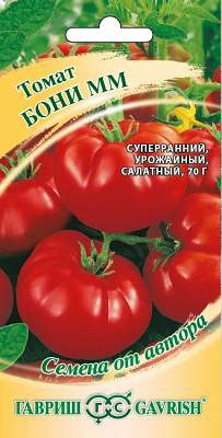 Томат Бони ММ. Ультраскороспелый (80-85 дней от всходов до плодоношения) низкорослый (40-50 см) сорт, рекомендован для выращивания в открытом грунте. Растение штамбовое, не требует подвязки и пасынкования. Плоды плоскоокруглой формы, массой 60-70 г, преимущественно салатного назначения. Вследствие высокой скороспелости не поражается фитофторой, отдает весь урожай за 2 недели. Начало плодоношения — конец июня. Посев на рассаду — в начале-середине апреля. Пикировка в фазе первого настоящего листа. Высадка рассады в грунт — в мае в возрасте 30-35 дней. Сорт можно выращивать прямым посевом семян в начале мая под пленочные укрытия, при этом пикируют в открытый грунт в начале июня. Схема посадки: 30х50 см.