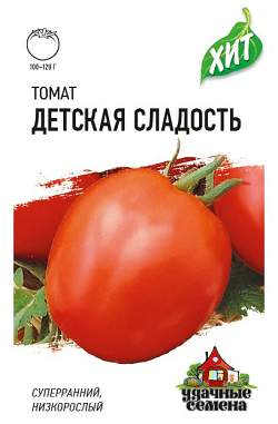 Томат Детская сладость. Суперранний (80-85 дней от всходов до уборки урожая) низкорослый сорт для выращивания в открытом грунте и под временными пленочными укрытиями. Растение детерминантное, высотой 50-60 см. Плоды яйцевидной формы, гладкие, ярко-красные, прочные, массой 100-120 г. Идеальны для цельноплодного консервирования и переработки на томатопродукты, хороши для приготовления салатов. Урожайность 5,5-6,0 кг/м2. Сорт устойчив к фузариозу, вертициллезу и вершинной гнили плодов.