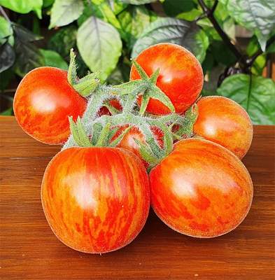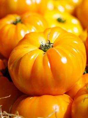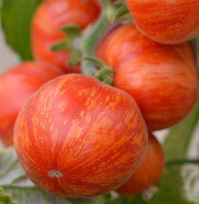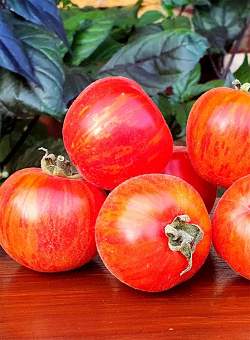 Томат Эльберта Персиковая. Один из самых красивых томатов. Он одновременно и полосатый и пушистый. Плоды некрупные, округлой или сливовидной формы, цвет красный, в жёлтую и полоску, массой до 100 г. Среднеспелый (90-105 дней), полуиндетерминантный. Куст бархатный, лист среднего размера, голубоватой окраски. Плоды сладкие и очень вкусные.