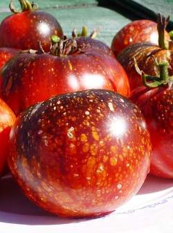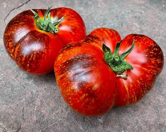 Томат Голубой Огонь. Очень красивый сорт. Среднеспелый. Плоды оранжево-красные с синими плечами и мазками и золотистыми крапинами, похожими на языки пламени. Мякоть розово-красная, плотная, сладкая. Другие названия сорта: Синий огонь, Огненно-синий, Синее пламя.