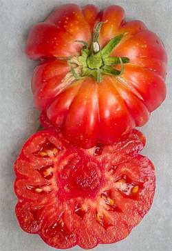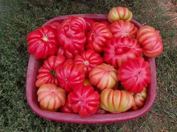 Томат Грибное Лукошко. Сорт среднепоздний, куст детерминантный, высотой до 90 см. Кисть простая, с 3-4 ярко-красным крупными, мясистыми плодами, массой 250-350 грамм. Плоды очень интересные, плоские, с ярко выраженной ребристостью создающей впечатление, будто томат состоит из отдельных долек. Мякоть их очень нежная, приятного вкуса. Томаты оригинально смотрятся на кусте и, конечно же, внесут разнообразие при оформлении вашего праздничного стола. Урожайность сорта до 3 кг с растения.