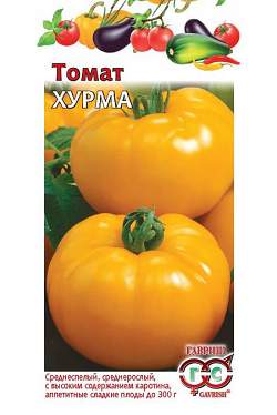 Томат Хурма. Среднеспелый среднерослый сорт для выращивания в пленочных теплицах и открытом грунте с подвязкой к кольям. Растение детерминантного типа (с ограниченным ростом), высотой 70-100 см. Плоды плоскоокруглые, золотисто-оранжевые, массой до 300 г, с нежной мякотью, содержат много каротина. Благодаря сбалансированному содержанию сахара и органических кислот очень приятного вкуса. Плоды прекрасно подойдут для приготовления свежих летних салатов. Сорт отличается продолжительным плодоношением. Посев на рассаду — в конце марта — начале апреля. Пикировка — в фазе первого настоящего листа. Высадка в грунт — в конце мая — начале июня. Подвязка, регулярные подкормки, сбор плодов в бланжевой спелости с последующим дозариванием увеличивает выход урожая до 3,0 кг с растения.