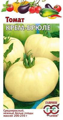 Томат Крем-брюле. Уникальная кремово-белая окраска плодов этого позднего среднерослого сорта вызывает интерес, как у садоводов, так и у кулинаров. Растение высотой 140-150 см, в кисти формирует по 3-5 плоскоокруглых многокамерных плодов массой 200-250 г. Рекомендуется для выращивания в открытом (с подвязкой к кольям) и защищенном грунте. Нежная окраска томата выгодно оттеняет другие овощи в консервированных салатах, поэтому гурманы так любят использовать белые томаты для приготовления ассорти с капустой и огурцами. Яркий акцент и приятный вкус закуске добавят традиционные русские ягоды — клюква и брусника. Посев на рассаду в марте-апреле на глубину 1-2 см. Пикировка в фазе 2-3 настоящих листьев. Посадка рассады в теплицу в апреле-мае, в грунт — в июне. После высадки в открытый грунт растения подвязывают и пасынкуют. Схема посадки: 40x60 см.
