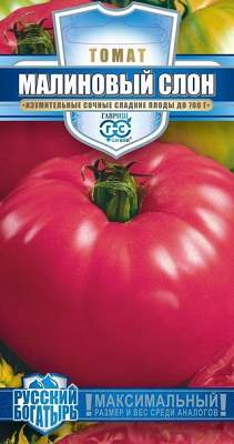 Томат Малиновый слон. Среднеспелый (113-117 дней от всходов до плодоношения) крупноплодный томат для выращивания в открытом грунте (в южных регионах с подвязкой к кольям) и под пленочными укрытиями. Растение индетерминантное, высотой более 2 м. В кисти образуется до 6 сочных аппетитных плодов массой 400-500 г, часто до 700 г. Плоды плоско-округлой формы, слабо-ребристые, малиново — розовые, с нежной сахарной мякотью и изумительным ароматом. Прекрасный салатный сорт, подходит для консервирования кусочками, в сочетании с сортами Сибирский гигант и Оранжевый слон получаются очень яркие и вкусные овощные нарезки. Выращивают рассадным способом. Пикировку производят в фазе первого настоящего листа. После высадки растений в теплицу, растения подвязывают к опоре. Формируют в один стебель, удаляя все "пасынки" и нижние листья, а также прищипывают точку роста в конце вегетации. Схема посадки: 40х60 см. Плоды собирают по мере созревания.