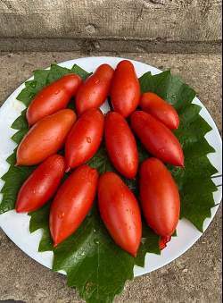 Плод удлиненно-овальный с носиком, красного цвета, обладает отличными вкусовыми качествами. Предназначены для потребления в свежем виде и всех видов переработки. Обладают хорошей лежкостью. Особенности выращивания: рекомендуется для выращивания в стеклянных и плёночных теплицах на вертикальных опорах или шпалере. Растение формируют в 1 стебель и своевременно пасынкуют.