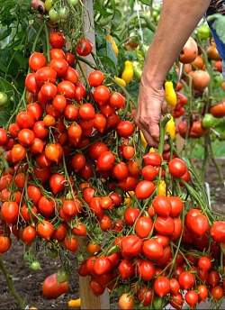 Томат Поцелуй Герани. Индетерминантный, до 1,6 м в теплице, в открытом грунте 0,6-0,8 м. Среднеспелый. Помидоры ярко-красные, округло-сливовидной формы с острым носиком, массой 30-40 грамм. Вкус насыщенный, с выраженной сладостью. В кистях до 120 цветков, завязывается до 80 и более плодов. При созревании помидоры не осыпаются и не трескаются, кисти до 2 кг. Отличный сорт для консервации.