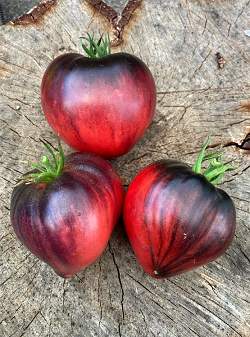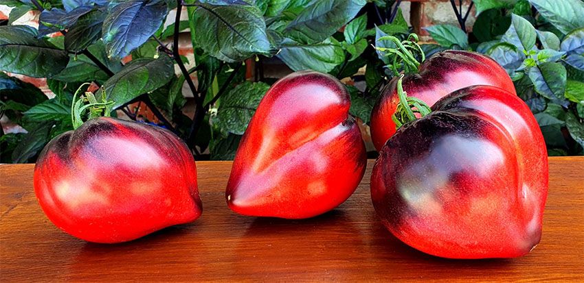 Сержант Пеппер относится к группе томатов с антоцианом, он придает темный цвет окраске и очень полезен для организма. Имеет чуть вытянутую форму с заостренным носиком, напоминающую в разрезе сердце. Масса помидора составляет до 150 граммов, в редких случаях 200-300 грамм. Мякоть ярко-розовая, очень сочная и ароматная, имеет карамельный привкус.