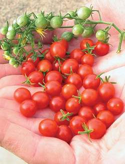 Томат Сладкий Горошек. Сорт относится к так называемым смородиновым томатам. Эти помидоры наиболее близки к диким разновидностям томата. Такое название они получили из-за схожести плодов с ягодами смородины. Отличительная особенность этих томатов в высокой урожайности и устойчивости к неблагоприятным условиям выращивания. Они могут выращиваться в открытом грунте в средней полосе. Длительного периода плодоношения до самых заморозков. С одного куста можно собрать до ведра маленьких помидорок. Мякоть сочная, хрустящая, очень сладкая.