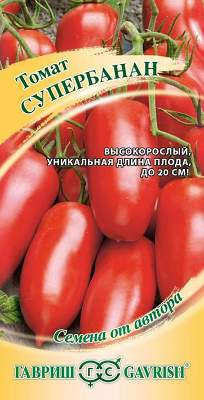 Томат Супербанан. Среднеспелый (110-115 дней от всходов до плодоношения) высокорослый сорт для выращивания в пленочных и остекленных теплицах. Растение индетерминантное, высотой более 2 м. Плоды банановидные, необыкновенно длинные, 15-20 см, насыщенно-красного цвета, располагаются на соцветиях по 10-12 шт. Масса 120-160 г. Мякоть плотная, сочная, с приятным сладким вкусом. Благодаря форме плодов сорт отлично подойдет для приготовления ровной красивой нарезки, салатов и украшения блюд. Урожайность одного растения до 9,0 кг. Посев на рассаду — в конце февраля — начале марта. Пикировка — в фазе первого настоящего листа. Высадка рассады в теплицы — в конце апреля — начале мая. Обязательна подвязка растений через несколько дней после высадки. Формируют в один стебель, удаляя все "пасынки" и нижние листья, а также прищипывают точку роста в конце вегетации. Схема посадки: 40х60 см. Плоды собирают по мере созревания.