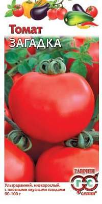 Томат Загадка. Ультраранний (80-85 дней от всходов до сбора урожая) низкорослый сорт для выращивания в открытом грунте, на балконе и подоконнике. Растение детерминантного типа (с ограниченным ростом), высотой 40 см. Плоды округлые, слаборебристые, красные, плотные, мясистые, с прекрасным вкусом массой 90-100 г, для салатов и консервирования. Неприхотливый сорт, плодоносит даже в холодное дождливое лето, обладает комплексной устойчивостью к болезням томатов. Посев на рассаду — в начале — середине апреля. Пикировка — в фазе первого настоящего листа. Высадка в открытый грунт — в начале мая под временные пленочные укрытия. Растения не требуют пасынкования и подвязки.