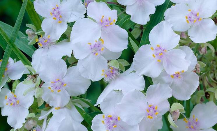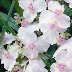 Традесканция Little White Doll (Литл Уайт Долл). Цветок белый, тычинки сиреневые, венчаются желтыми пыльниками. Очаровательный невысокий сорт. Максимальная высота 45 см. Отлично растет на любых почвах, кроме сухих. Любит влагу и солнце. Цветет с июня по сентябрь включительно. Отличное ландшафтное растение — неприхотливое и очень выразительное.