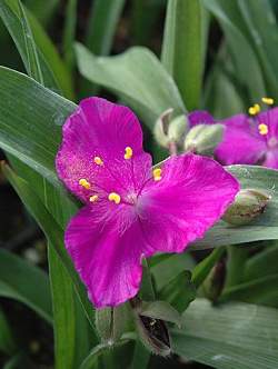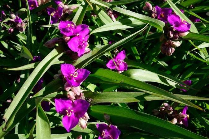 Традесканция Rubra (Рубра). Высота многолетника варьируется от 40 до 60 сантиметров. Листья узкие, длинные. Цветки диаметром 3-4 сантиметра, трехлопастные, пурпурного оттенка, с желтыми тычинками. Отдельно взятый цветочек живет недолго, а многочисленные округлые бутоны, распускаются каждое утро.