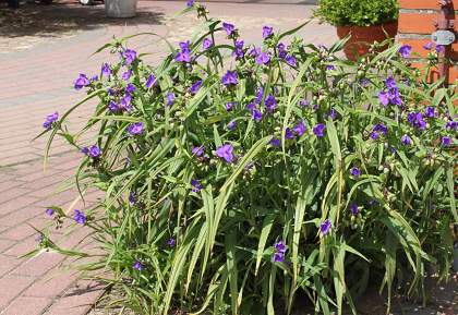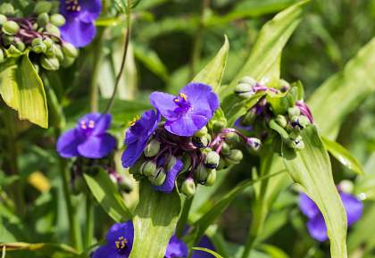 Традесканция Zwanenburg Blue (Цваненбург Блу). Высота растения 40-60 см, листья саблевидные, около 20 см длиной. Цветки голубовато-фиолетовые, крупные, собраны в зонтиковидные соцветия, появляются в начале лета и не исчезают до осени. Каждый цветок раскрывается всего на один день, но гроздья бутонов в каждом соцветии гарантируют длительное, непрерывное цветение. Декоративна в течение всего сезона.