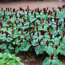 Триллиум сидячий (Trillium sessile) — растение высотой до 25 см с зелеными или синевато зелеными листьями каждое длиной до 10 см и шириной до 8 см, иногда с серебристым блеском. Лепестки цветков заостренные на концах, коричнево-красные. Аромат есть, пряный.