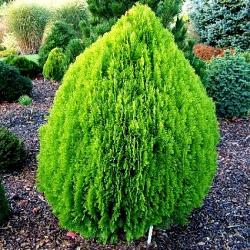 Туя восточная Aurea Nana (Ауреа Нана). Карликовый медленнорастущий вечнозеленый кустарник с яйцевидной формой кроны. Побеги плотно расположенные, нежные, золотисто-желтые. После 10 лет достигает высоты 0,7 м. Хвоя чешуйчатая, частая, интенсивно золотисто-желтая, даже зимой.