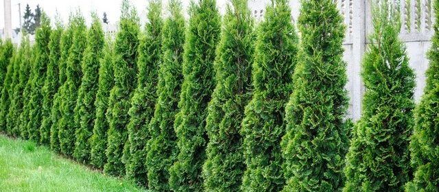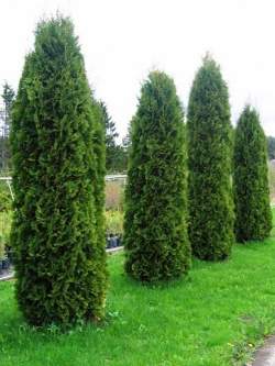 Туя Brabant (Брабант). Самый быстрорастущий сорт туи с колонновидной кроной, достигающий более 3,5-5 м. Хвоя светло-зелёная. Нуждается в плодородной влажной почве. Месторасположение — солнце, полутень. Рекомендуется для формирования живых изгородей, частота посадки в ряду: каждые 0,5-0,7 м, также хороша для одиночных посадок.