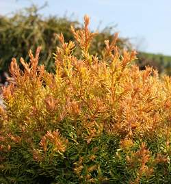 Туя Cloth of Gold (Клос оф Голд). Изящный кустарник высотой до 2 м и шириной до 1,2 м, с удлиненно-яйцевидной или ширококонической кроной и плотно расположенными, тонкими побегами. Хвоя нежная, двух типов — игольчатая и чешуевидная, от лимонно-желтого до желто-оранжевого цвета, зимой приобретает медный оттенок. Растет медленно.