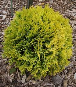 Туя Danica Aurea (Даника Ауреа). Карликовый шаровидный кустарник, достигающий в возрасте 10 лет 0,4 м в диаметре. Побеги короткие, плотно расположенные, желто-зеленого цвета.