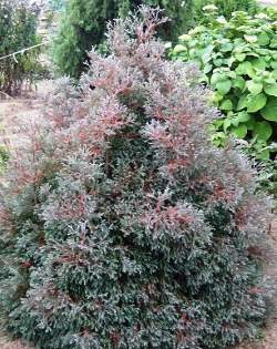 Крона асимметричная, многовершинная, округлая или уплощенно-овальная. Хвоя шиловидная, мягкая, матовая, сверху окрашена в непривычный для туй дымчато-серебристо-зеленый тон, снизу серовато-зеленая. Зимой хвоя становится красновато-бронзово-коричневой, к весне быстро восстанавливает прежний цвет.