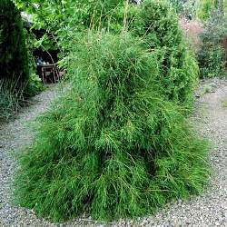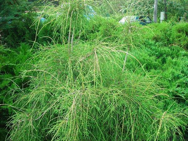 Ветви прямые, от них отходят длинные поникающие нитевидные веточки. Хвоя ярко-зелёная, чешуйчатая, зимой – коричневая. Место солнечное. Украшение сада, растение, способное создавать определенный колорит. Полностью морозостойка.