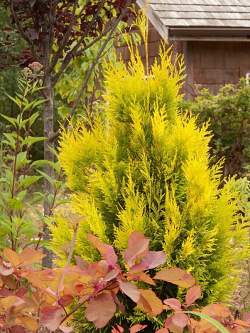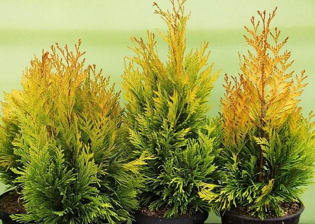 Туя Forever Goldy (Голди Форевер). Разноцветная туя. Хвоя чешуевидная, мягкая, летом светло-зелёная с желтоватым оттенком, осенью при понижении температуры ниже +5ºС — смешанная ярко-жёлтая и оранжево-золотистая, зимой — яркая золотисто-жёлтая. Молодые побеги оранжево-красные, более старые — красновато-коричневые.