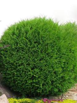 Туя Globosa (Глобоза). Компактный кустарник шаровидной или овальной формы, достигающий полутора метров в высоту и от двух до трёх метров в ширину, считается самым крупным из всех карликовых шаровидных сортов. Крона кустарника плотная и компактная из-за густо расположенных побегов, перекрывающих друг друга и растущих во все стороны, не требует дополнительного ухода в виде частых стрижек, поскольку шаровидность формируется самостоятельно. Это очень удобно, особенно для садоводов-любителей, не имеющих достаточного опыта в декоративном садоводстве.