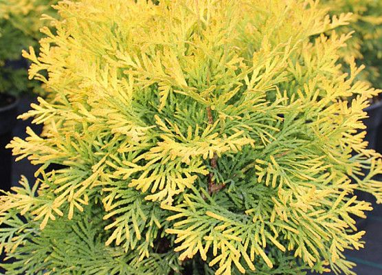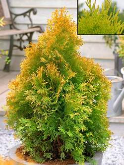 Туя Golden Anne (Голден Анн). Карликовый сорт, форма компактная, пирамидальная. Растёт медленно, к 10-ти годам высота 80 см . Хвоя круглый год золотистого оттенка, не сгорает под интенсивными лучами солнца. Сорт достаточно выносливый, хорошо переносит стрижку. Место солнечное или полутенистое. Почва умеренно влажная. Может переносить затенение и сухость. Прекрасно подходит для небольших садов, зона 4 (до -29°С).