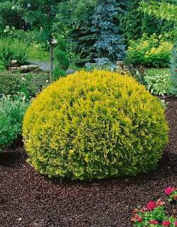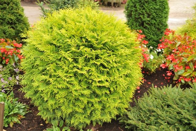 Туя западная Golden Globe (Голден Глоуб). Умеренно растущий шаровидный кустарник. Хвоя светло-зеленая, концы побегов золотисто-желтые. Очень декоративный сорт. Прирост 8-10 см. Достигает 1-1,2 в диаметре. Требует плодородной и влажной почвы. Не требует стрижки. Месторасположение — солнце, полутень. Рекомендуется высаживать в небольших садах и цветных композициях.