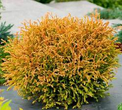 Туя Golden Tuffet (Голден Таффет). Карликовый сорт с шаровидной плотной формой, высотой до 0,6 м. Побеги тонкие, короткие, гибкие, повисающие. Молодые побеги и чешуйки (игольчатые) имеют золотисто-оранжевую окраску, сохраняющуюся также зимой.