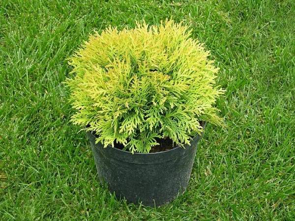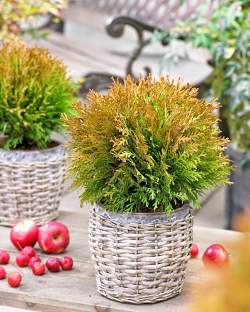 Туя западная Mirjam (Мириам). Хвойный шаровидный медленнорастущий кустарник, новый сорт, полученный мутацией сорта Даника. Настоящий хвойный карлик, вырастающий не более 80 см в диаметре. Крона плотная, хвоя желто-зеленая, чешуевидная. Зимой хвоя приобретает бронзовый окрас, весной снова желтеет. Благодаря симметричной правильной форме и золотистой листве туя западная Мириам очень быстро стала популярна.