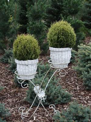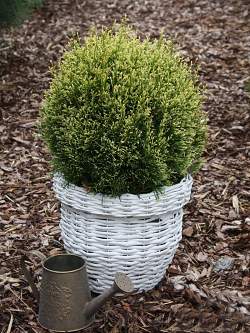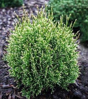 Туя Miss Frosty (Мисс Фрости). Растет медленно. Со временем приобретает форму широкого конуса. К десяти годам достигает 100 см в высоту и 60 см в диаметре. Белая хвоя на кончиках побегов создает впечатление, что туя покрыта инеем.