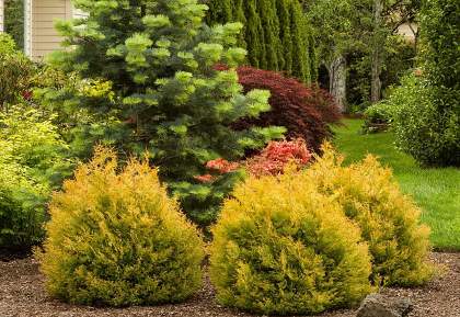 Туя западная Rheingold (Рейнголд). Хвоя при распускании розоватая, летом желто-зеленая, зимой бронзово-красная. Вечнозеленый кустарник в молодости округлый, позднее в форме широкой колонны. Медленнорастущий, 2-5 м высотой, 1,5-3 м шириной.