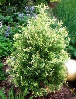 Туя западная Spotty Smaragd (Спотти Смарагд). Крона узкой конической формы. Окрашена в зеленый цвет с молочными вкраплениями. Высота взрослого дерева составляет несколько метров. Ширина не превышает метра. Сорт теневыносливый и морозоустойчивый.