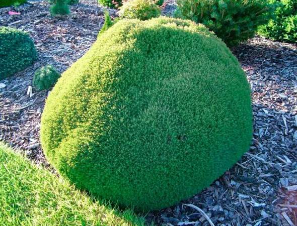 Туя западная Teddy (Тедди). Карликовый шаровидный сорт туи. Побеги тонкие, густо расположенные, у молодых экземпляров с игольчатой хвоей. Достигает 0,3 м в диаметре. Прирост 2-3 см в год. Требует плодородной и влажной почвы. Не требует стрижки. Месторасположение — солнце, полутень.