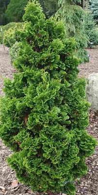 Туя западная Zmatlic (Зматлик). Узкоконическая форма, растёт медленно, к 10-ти годам высота 130 см, ширина 50 см. Веточки похожи на ракушки, расположены плотно, слегка закручены вокруг своей оси. Хвоя красивая тёмно-зелёная.