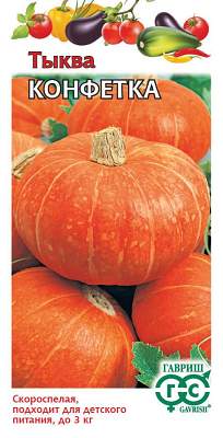 Тыква Конфетка. Скороспелый (85-95 дней от всходов до созревания) сорт. Плетистое растение одновременно формирует до 6 хорошо сегментированных плодов округлой формы, массой 1,5-3,0 кг. Окраска коры при созревании ярко-красная. Мякоть красно-оранжевая, хрустящая, сладкая, сочная. Вкус отличный. Обладает качествами пригодными для переработки и потребления в свежем виде. Используется при изготовлении пюре для детского питания. Выращивается как рассадным способом, так и прямым посевом в грунт. Глубина заделки 4-10 см, в зависимости от почвы. Хорошо отзывается на внесение органических удобрений. Собирают тыкву обязательно с плодоножками. Главное условие для успешного хранения — сухой воздух, проветриваемое помещение.