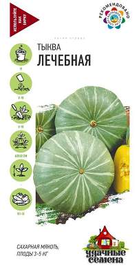 Тыква Лечебная. Раннеспелый (100-105 дней от всходов до плодоношения) сорт столового назначения. Растение компактное, короткоплетистое. Плоды округло-сплюснутые, слабосегментированные, светло-серой окраски, рисунок с короткими прерывистыми полосами. Масса плода 3,0-5,5 кг. Кора тонкая, кожистая. Мякоть светло-оранжевая, толстая, хрустящая, сладкая, сочная, с высоким содержанием каротина. Сорт урожайный, высокой товарности, вкусовые качества отличные. Может храниться до мая месяца. Выращивается как рассадным способом, так и прямым посевом в грунт. Посев на рассаду в апреле, высадка в грунт в мае — июне. Посев непосредственно в грунт в конце мая — июне. Хорошо отзывается на внесение органических удобрений. Схема посадки 80х80 см. Урожайность до 30,0 кг/м2.