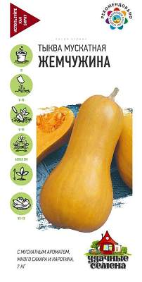 Тыква Жемчужина мускатная. Среднепоздний (100-110 дней от всходов до созревания) мускатный сорт. Растение мощное, плетистое, с 4-7 боковыми плетями. Плоды удлиненно-цилиндрической формы, массой 2,6-5,6 (до 7,5) кг. Окраска плодов желтовато-оранжевая, мякоти — оранжевая с красным оттенком. Семенное гнездо очень маленькое, расположено в вершинной части плода. Мякоть толстая, нежная, сочная, сладкая. Ценится за засухоустойчивость, высокий выход полезной мякоти, отличный вкус и высокое содержание каротина. Урожайность до 15 кг/м2.