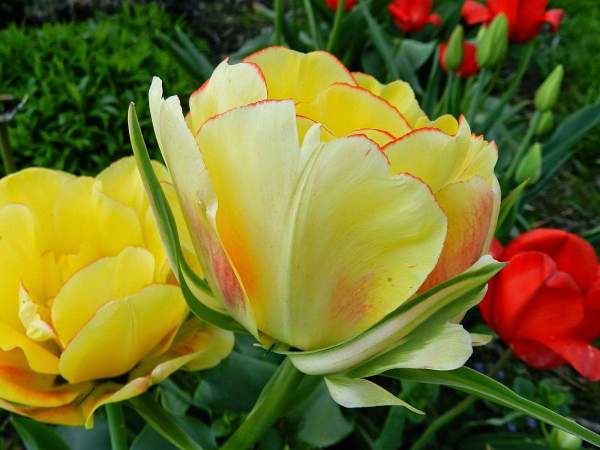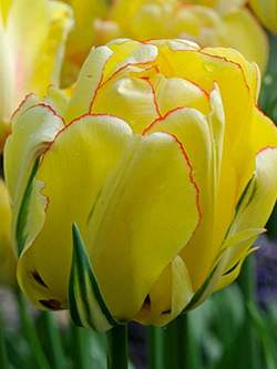 Тюльпан Akebono (Акебоно). Прекрасный крупный бокал. Цветок махровые, желтый с розовым румянцем, по краю лепестков тончайшая кайма. Высота 35 см. Срок цветения поздний.