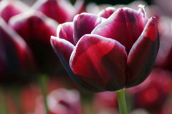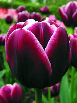 Тюльпан Alexander Pushkin (Александр Пушкин). Триумф. Роскошный тюльпан с крупным бокалом пурпурного цвета. По краю лепестков тонкая белая кайма, которая подчеркивает глубину основного цвета. Достаточно высокий — до 50 см. Хорош для срезки. Основное достоинство — долгое сохранение декоративности. Остается красивым до трех недель.